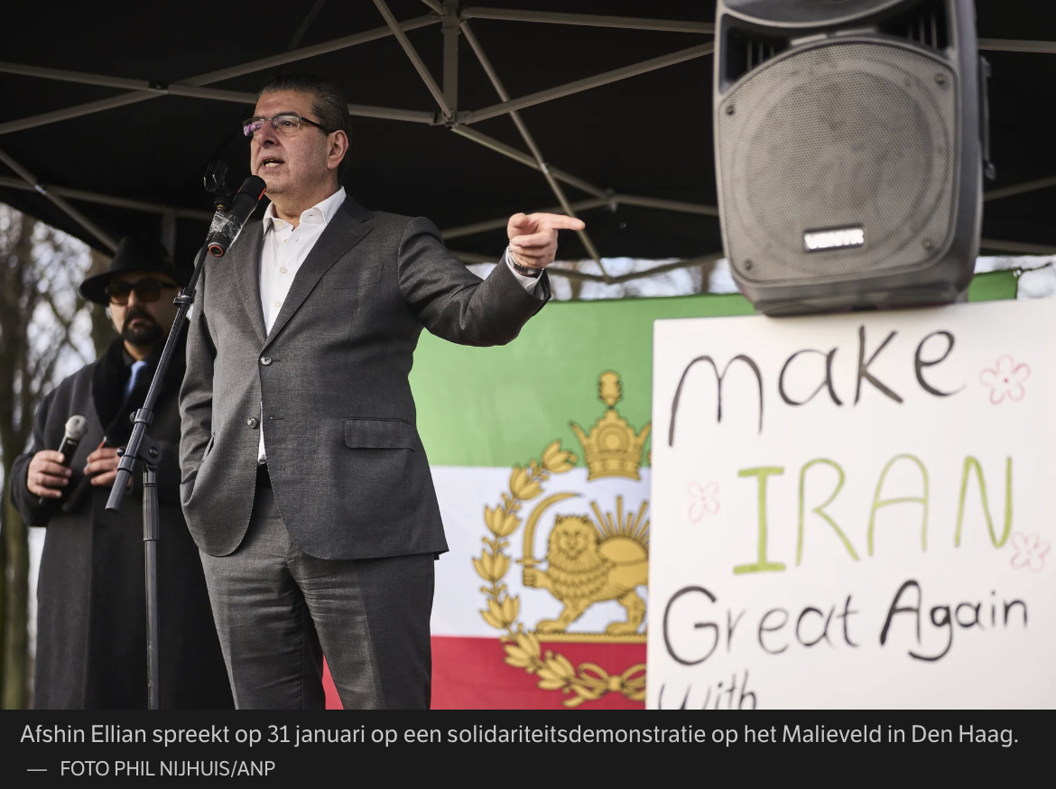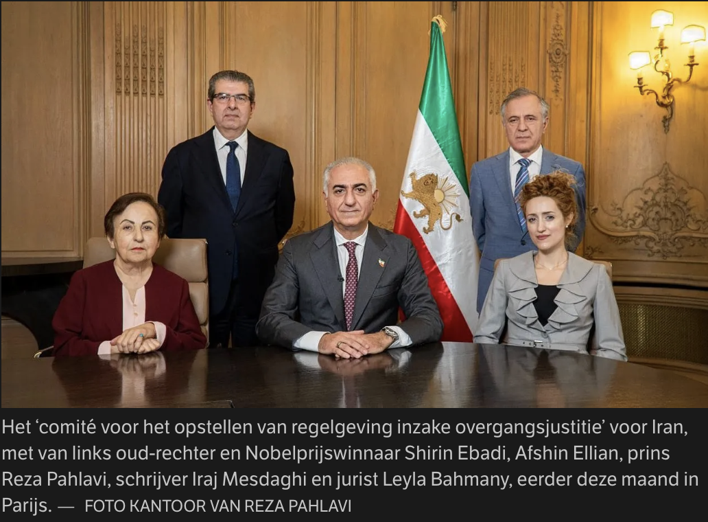 Regelmatig richt de Iraanse kroonprins Reza Pahlavi zich vanuit het buitenland tot zijn landgenoten. In een video van eerder deze maand is hij aanvankelijk alleen in beeld. Maar als hij begint over de Iraniërs die „vijf decennia lang slachtoffer zijn geweest van onrecht, marteling en onderdrukking door de Islamitische Republiek”, zoomt de camera uit. Pahlavi blijkt geflankeerd door twee vrouwen en twee mannen. Linksboven in beeld: Afshin Ellian, de Leidse hoogleraar Encyclopedie van de rechtswetenschap en columnist van De Telegraaf en EW. Ellian, vertelt de zoon van de sjah, is benoemd tot lid van een vierkoppig comité „voor het opstellen van regelgeving inzake overgangsjustitie”.